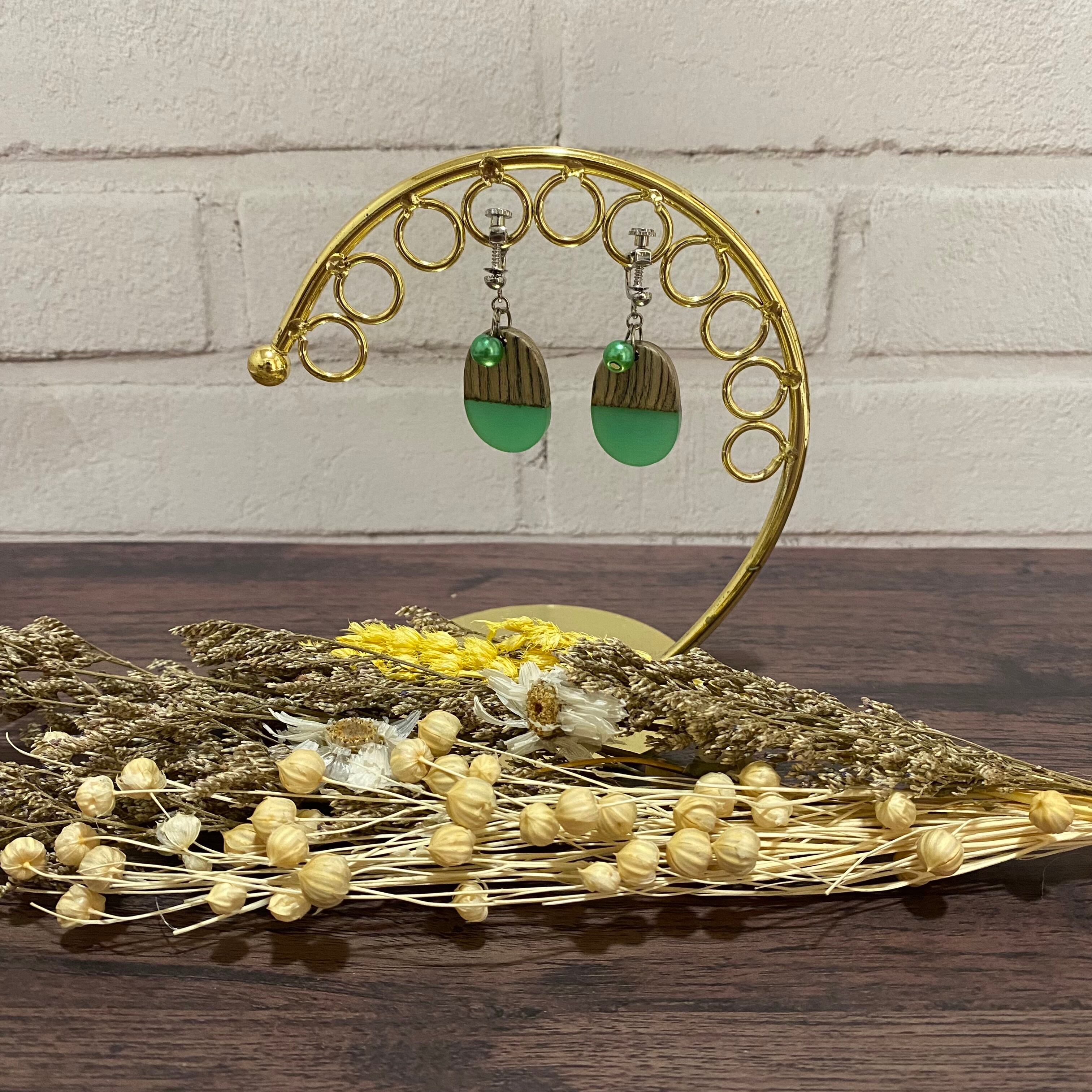 ウッドスタイルのイヤリングです。好きな色を選んで見たり、推しカラーで選んで見たり…様々な用途で使用できます。シンプルなデザインの為、色んなコーディネートに合わせやすくなっております。