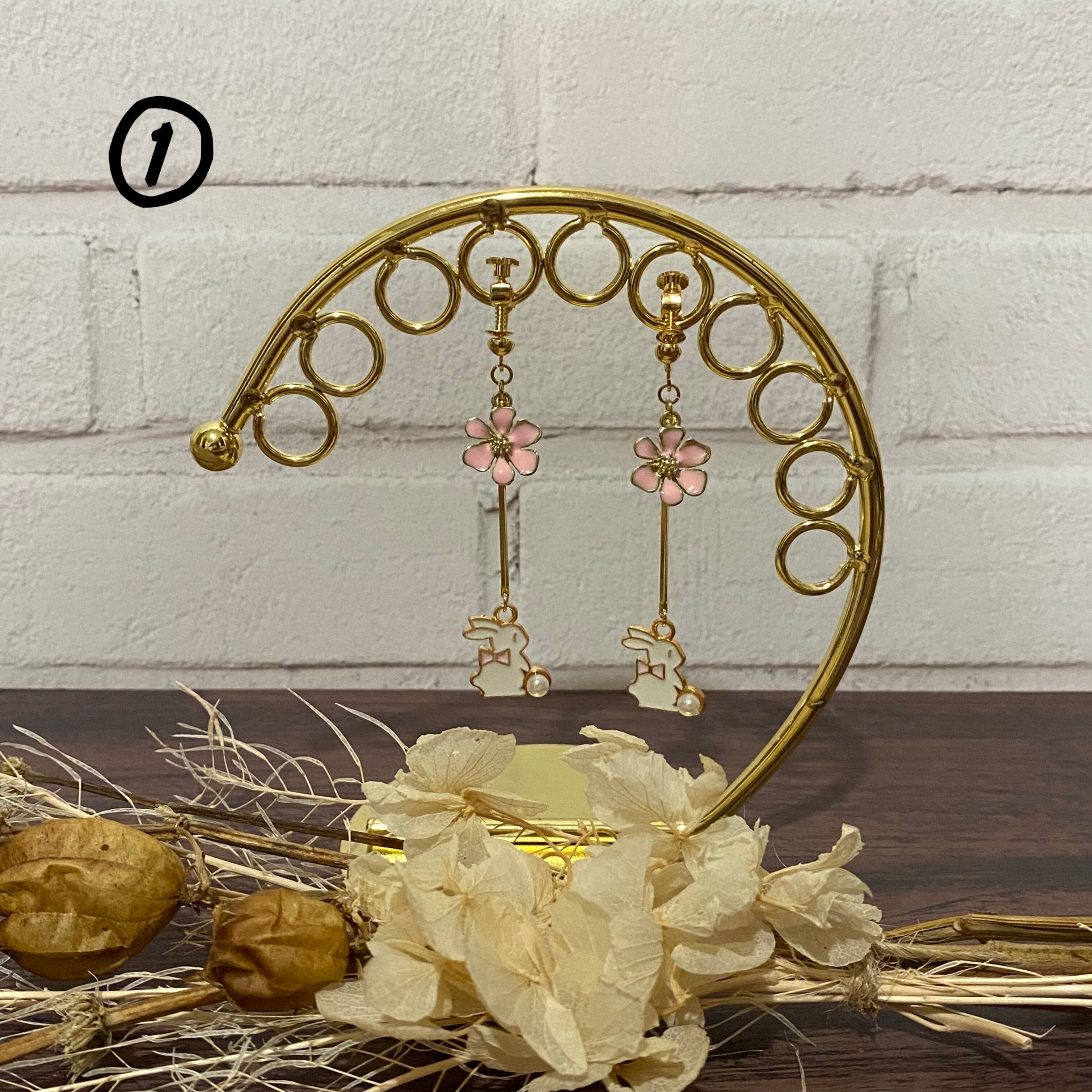 うさぎとねこの春らしいイヤリングです。色がピンクを基調としているため、女の子らしい可愛いイヤリングとなっております。