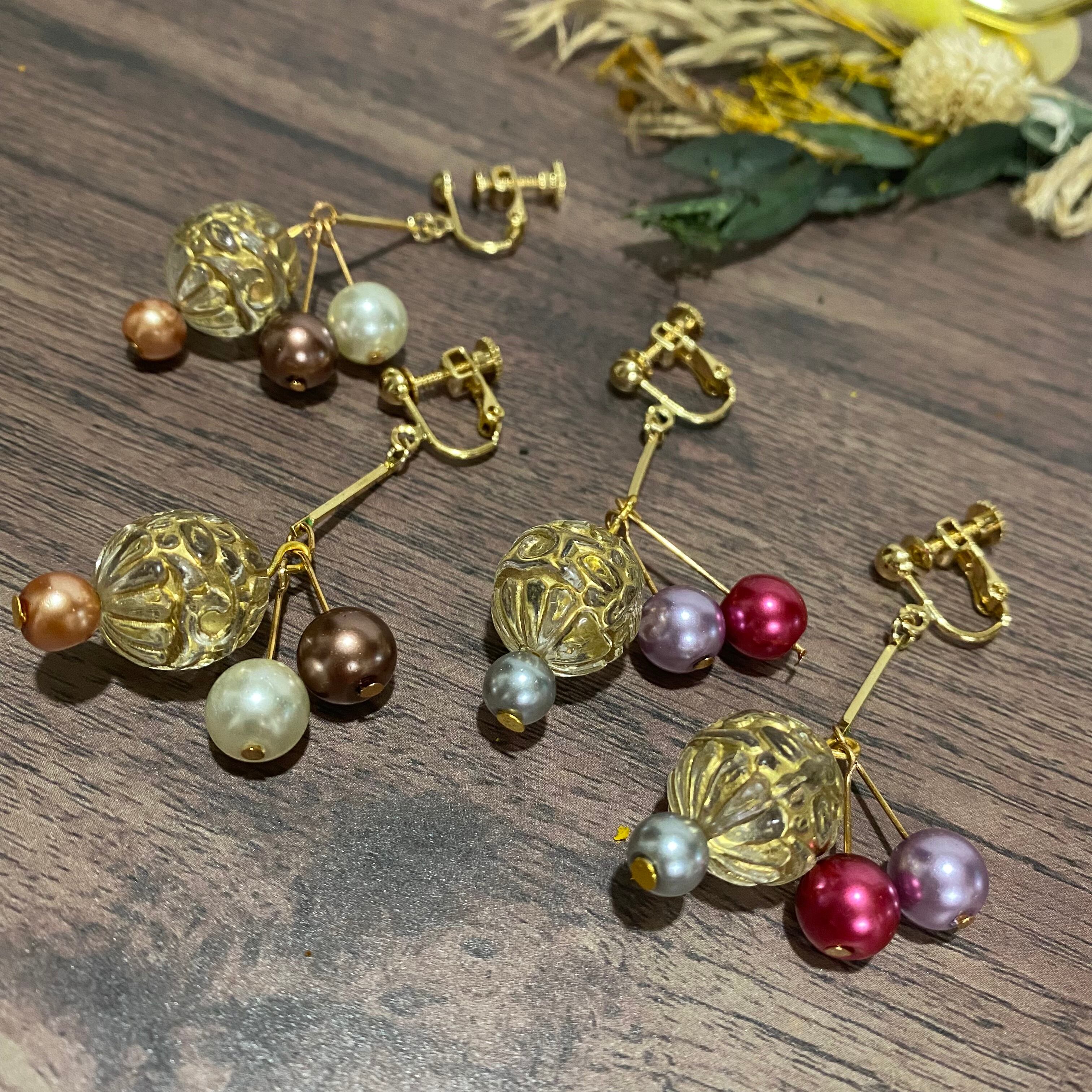 色んな大きさのパールビーズを組み合わせたイヤリングです。パールビーズで可愛さがありつつも、模様入りビーズで大人っぽさもあるイヤリングとなっております。