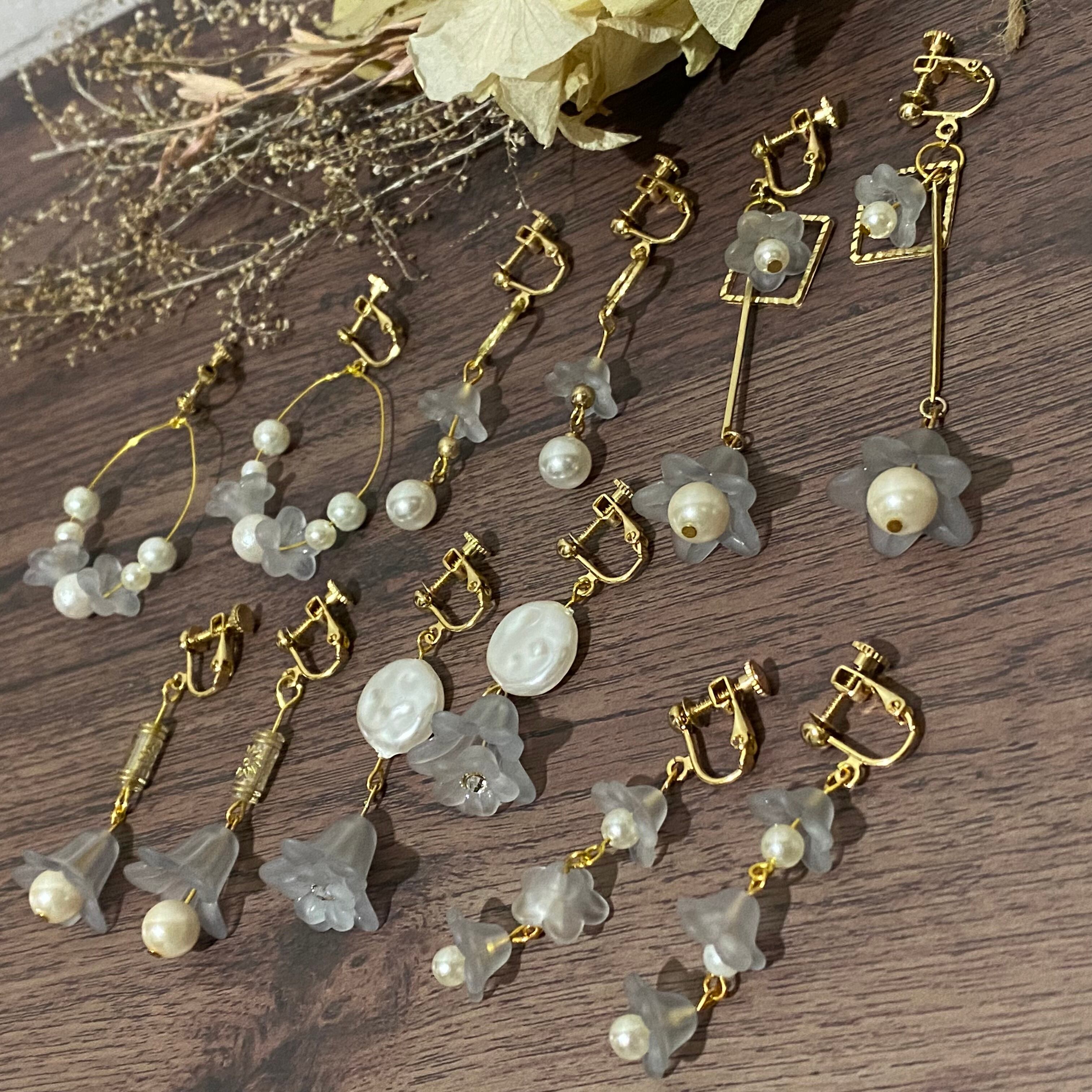 ほわいとイヤリングのグレーver.が出来ました。グレーの花を基調とした、大人可愛いイヤリングです。様々なデザインのイヤリングをご用意し、シンプルだけど大人っぽいイヤリングとなっております。どんなコーデにも合わせやすくなっているため、ご自宅にある洋服に合わせてご購入してみてください。