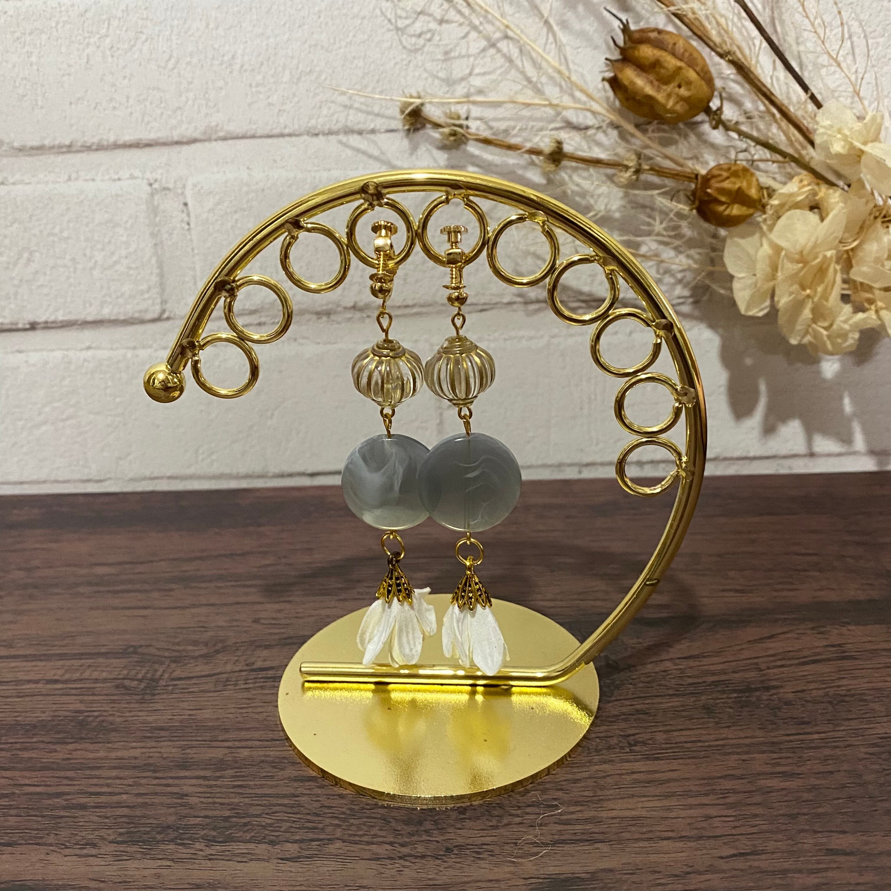天使のはねのような白いタッセルがついたイヤリングです。模様入りのビーズとグレーの大理石風パーツを付けることで大人っぽく見えるイヤリングとなっております。シンプルなコーデに合わせるとイヤリングが映えます!