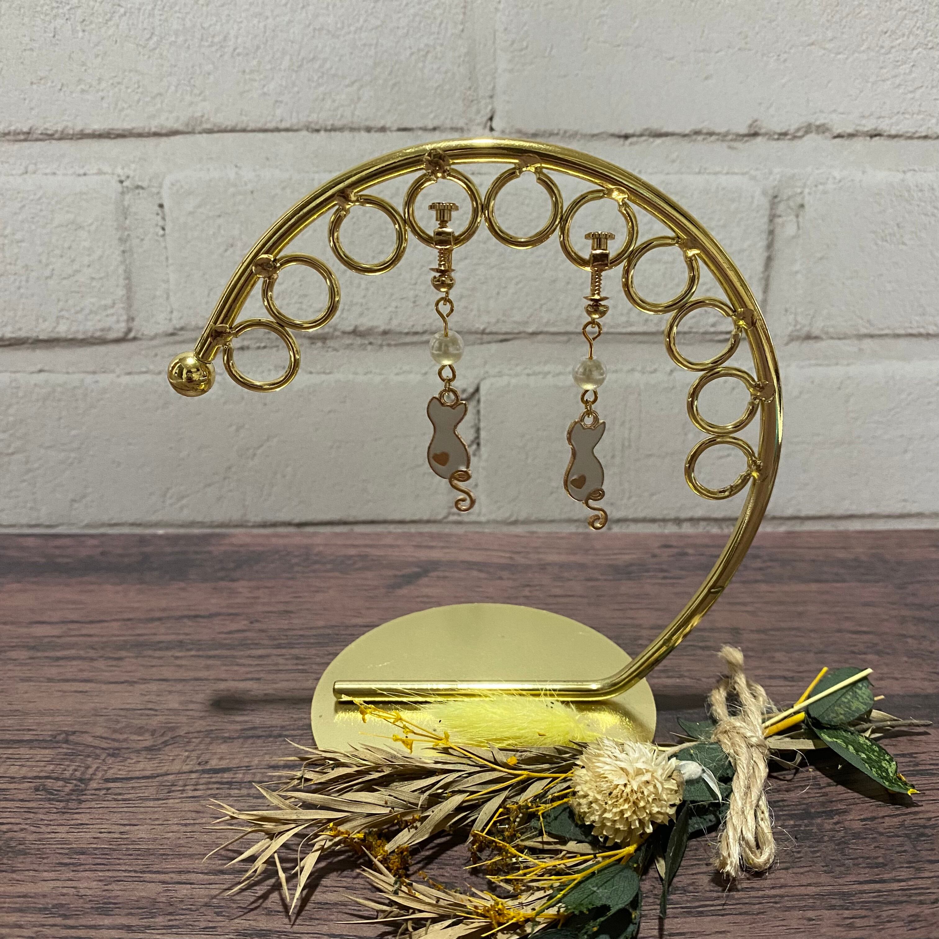 猫が耳元で揺れる可愛いイヤリングとなってます。キュートだけど、パールビーズがついてることで少し大人っぽさも見られる為、どなたでもつけやすいイヤリングだと思います。猫好きの方には特にオススメのイヤリングです!
