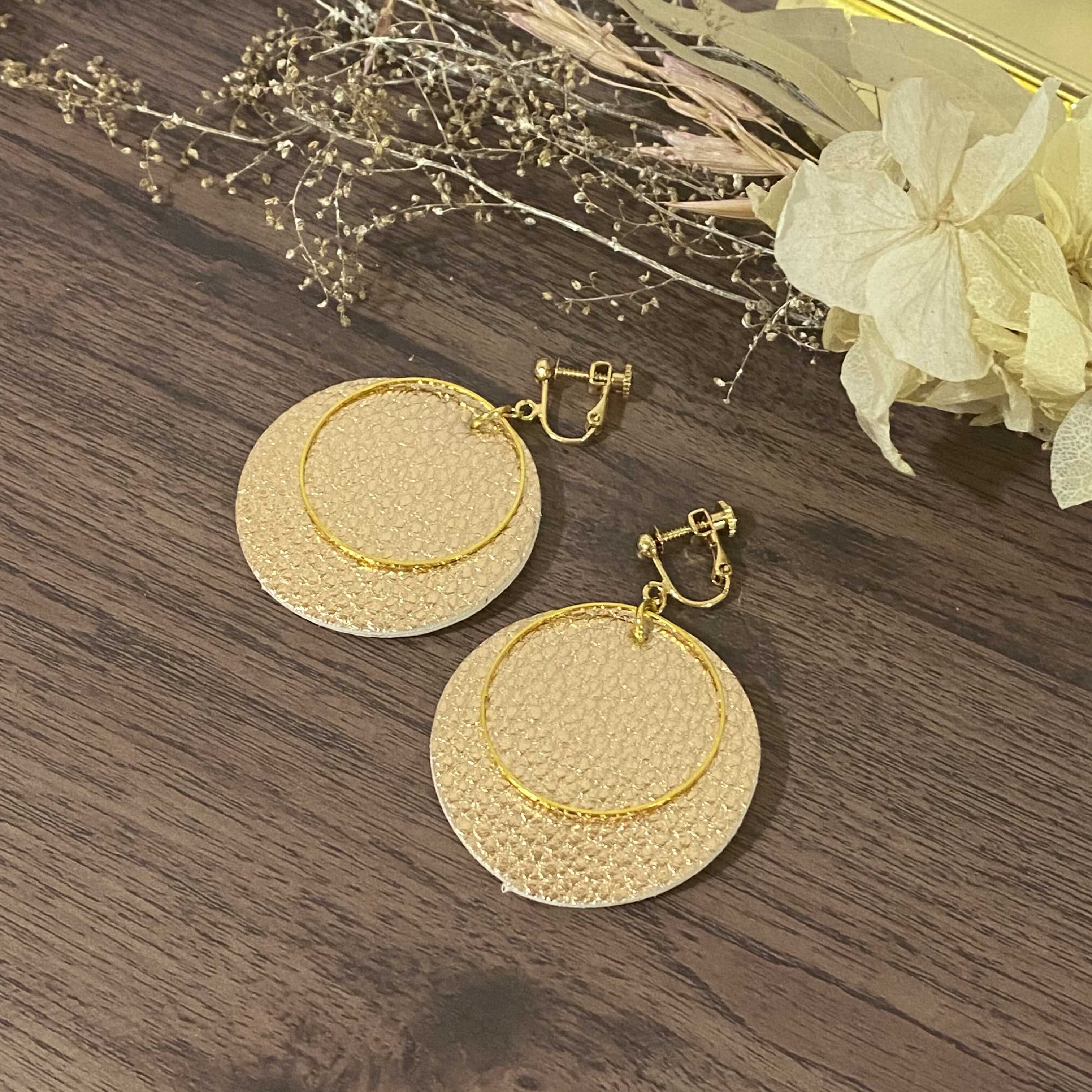 レザー生地のようなピンク味のある可愛らしいパーツに、ゴールドのフレームを取り入れる事によって大人っぽくも見えるイヤリングです。シンプルなデザインのため、どんな方でもつけやすいイヤリングとなっております。カジュアルコーデにはもちろん、華やかなコーデにしたいときのアクセントとしても使ってみてください。