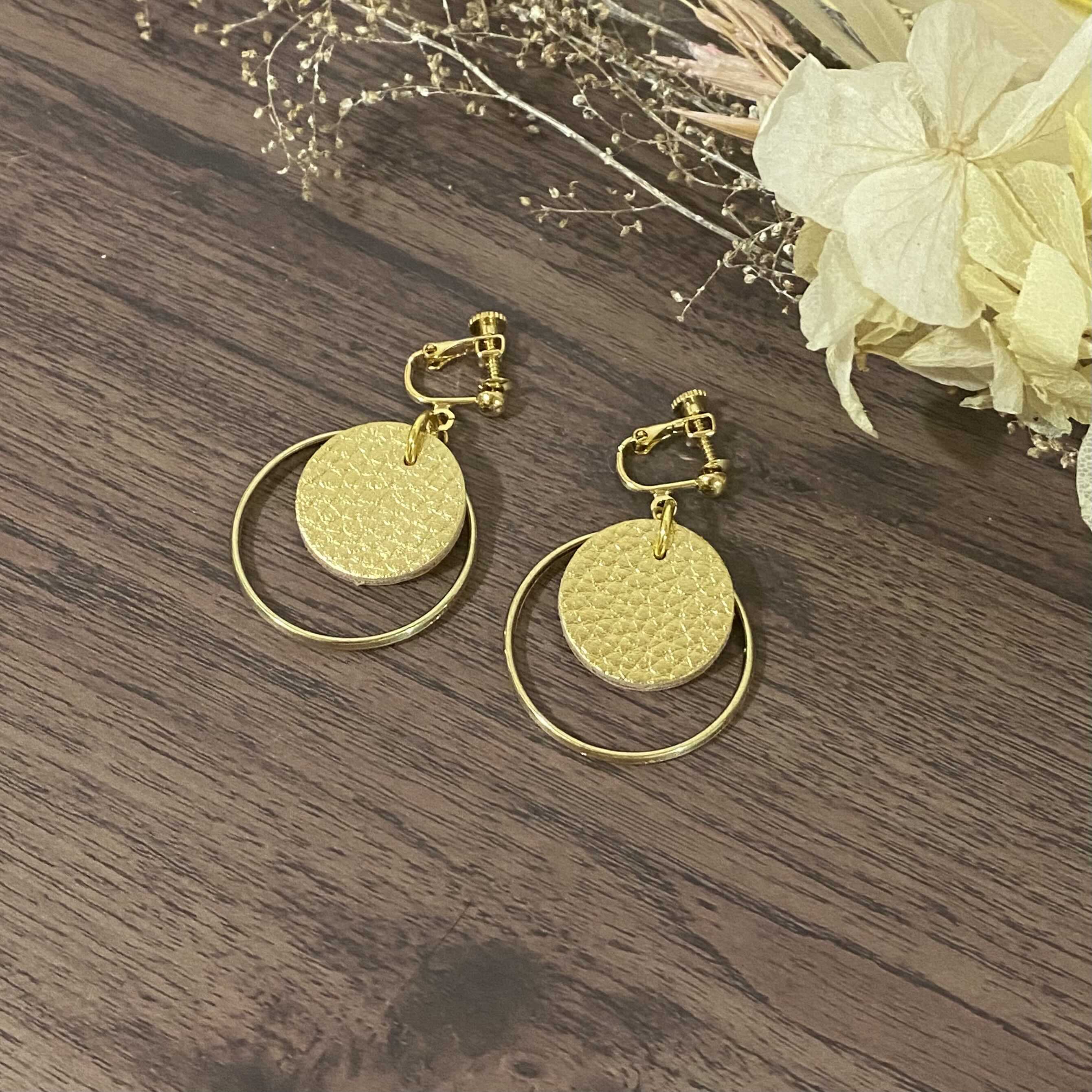シンプルなデザインながらもゴールドで統一している事により、華やかでインパクトを持たせるイヤリングとなっております。レザー生地のようなパーツを使用しているため、大人っぽく見えます。パーティーやイベントに合わせるにはもちろん、小さめの大ぶりイヤリングとなっている為、普段のコーデのちょっとしたアクセントとして合わせてみてください。