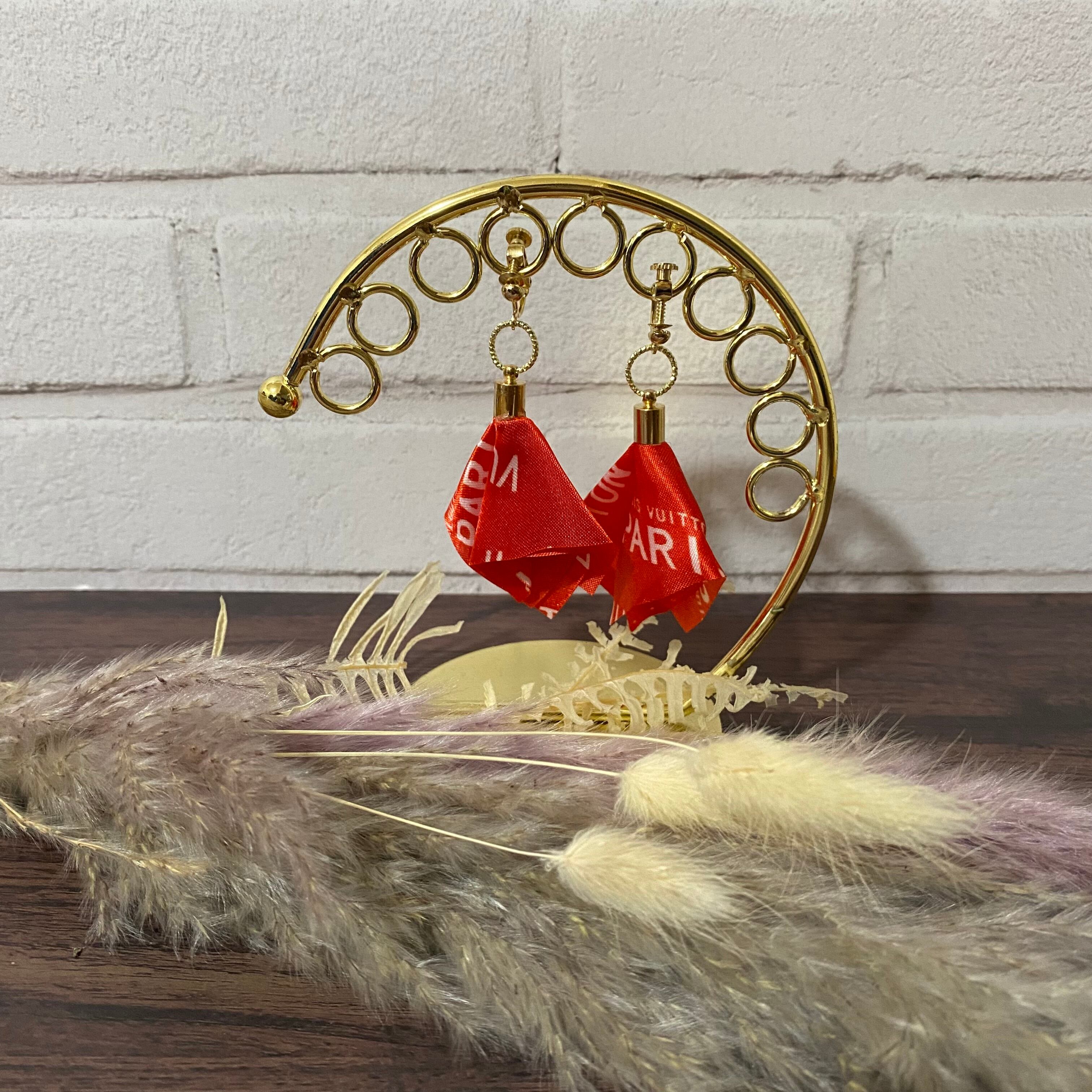 英字柄の布タッセルがメインのカジュアルイヤリングです。ハッキリとした色の布タッセルが個性を引き出し、ゴールドのリングがついていることでより華やかなイヤリングとなっております。カジュアルコーデはもちろん、デニムやアップスタイルにもオススメです。