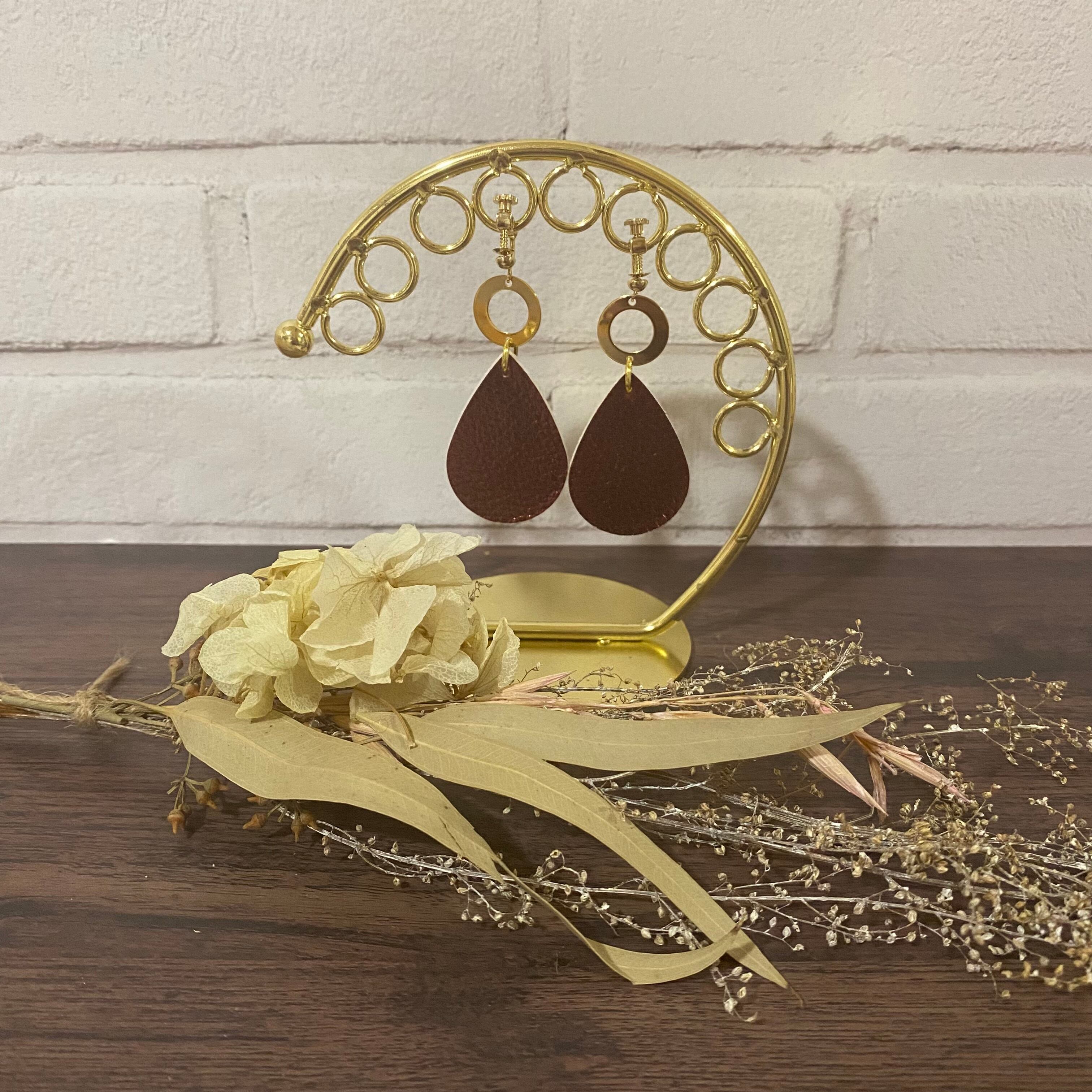 しなやかなレザーのような生地を使用したミニイヤリングです。他のレザー生地のイヤリングとは違って、小さめのイヤリングとなってますので、ちょっとしたインパクトを与えたい方にオススメです。黒とワインレッドを基調とした大人っぽさもあるイヤリングの為、特別なコーデから普段のコーデまで様々なコーデに合わせられるイヤリングです。