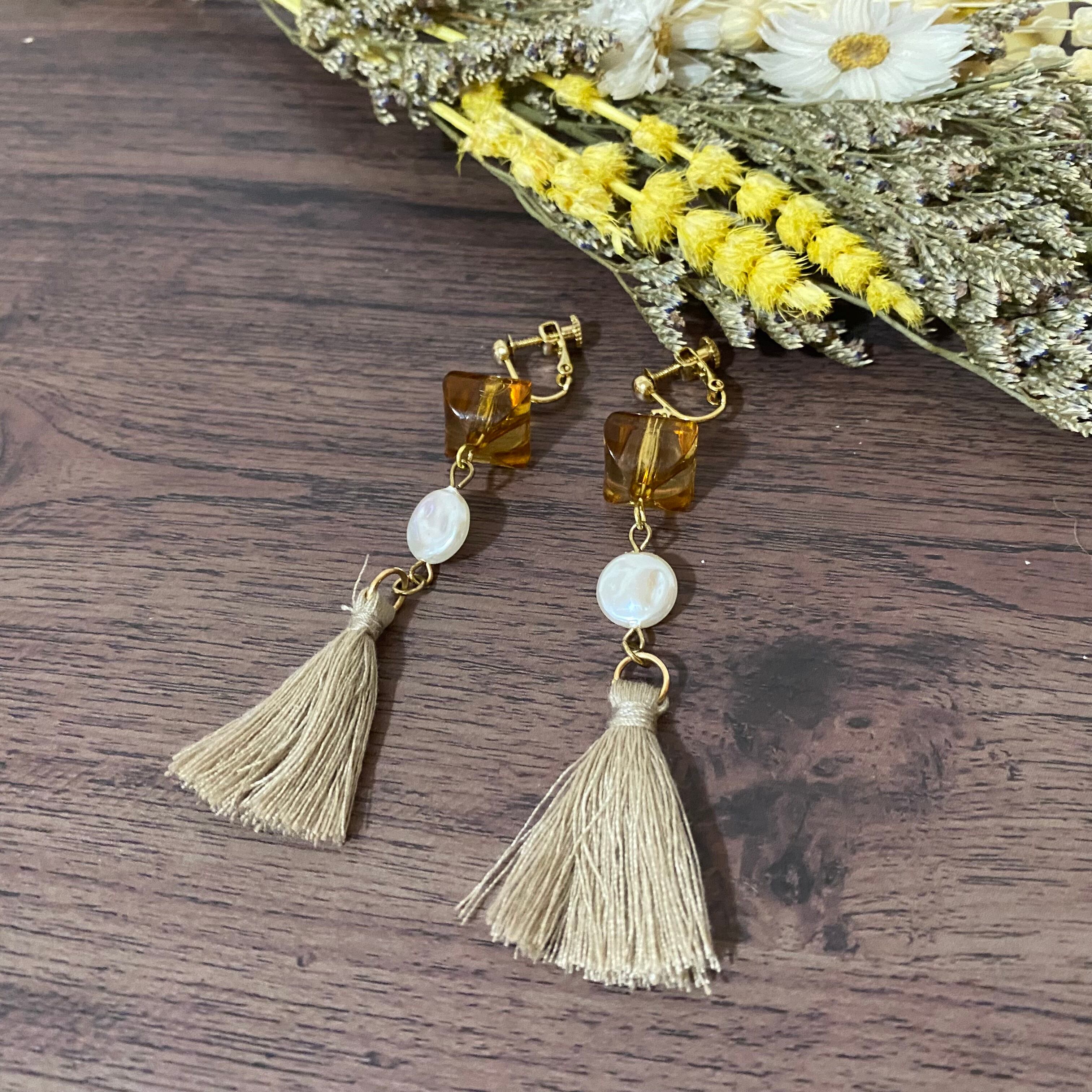 シンプルなデザインながらもタッセルがアクセントになり、どんなコーディネートにも合わせやすいイヤリングです。軽い素材の為、長時間つけてても耳が痛くなりにくくなってます。